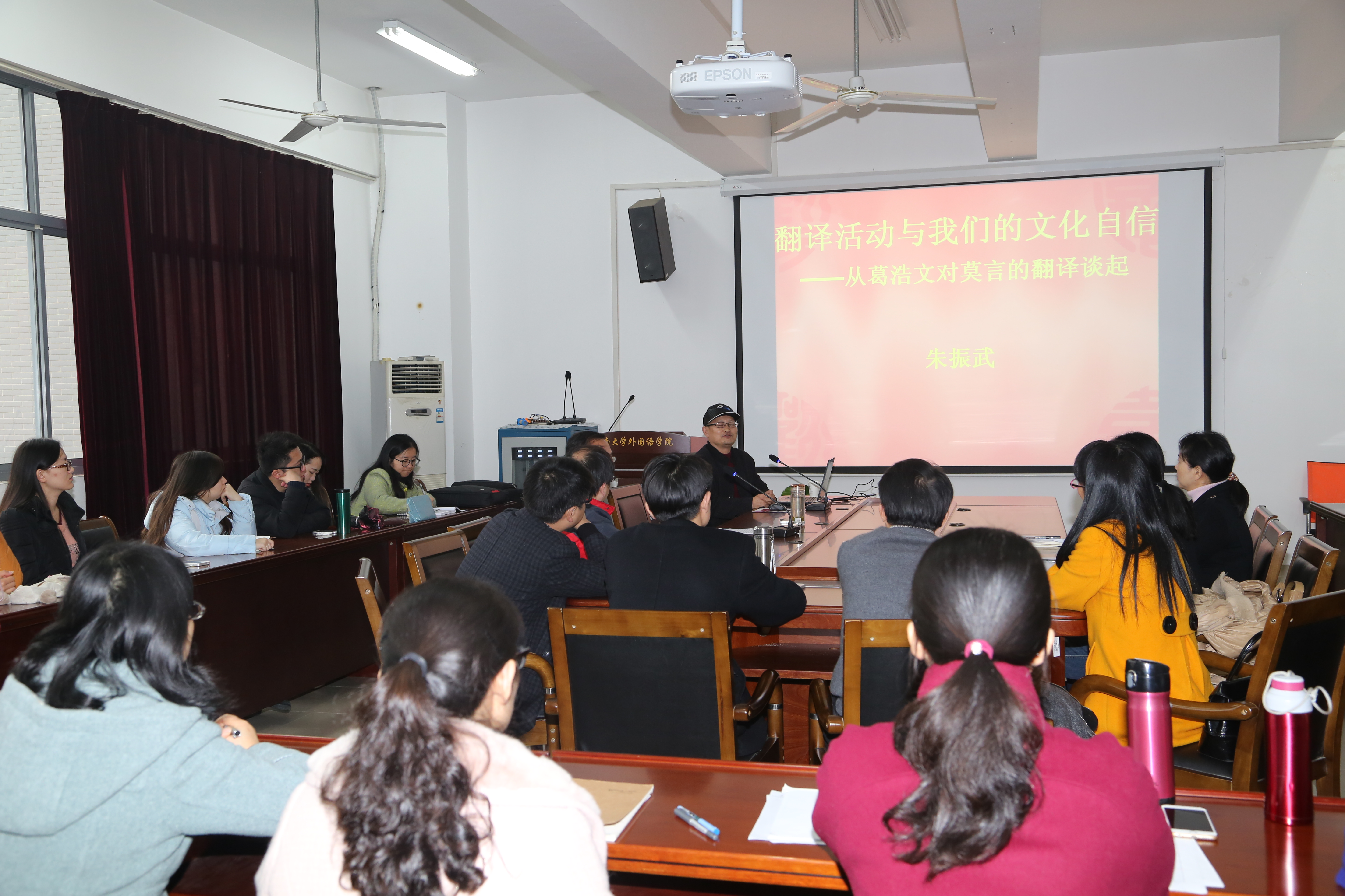 大会议室做了题为“翻译活动与我们的文化自信—从葛浩文对莫言的翻译谈起”的学术讲座。方文开副院长主持了讲座,水果派数十名中青年教师和14级硕士研究生聆听了讲座。