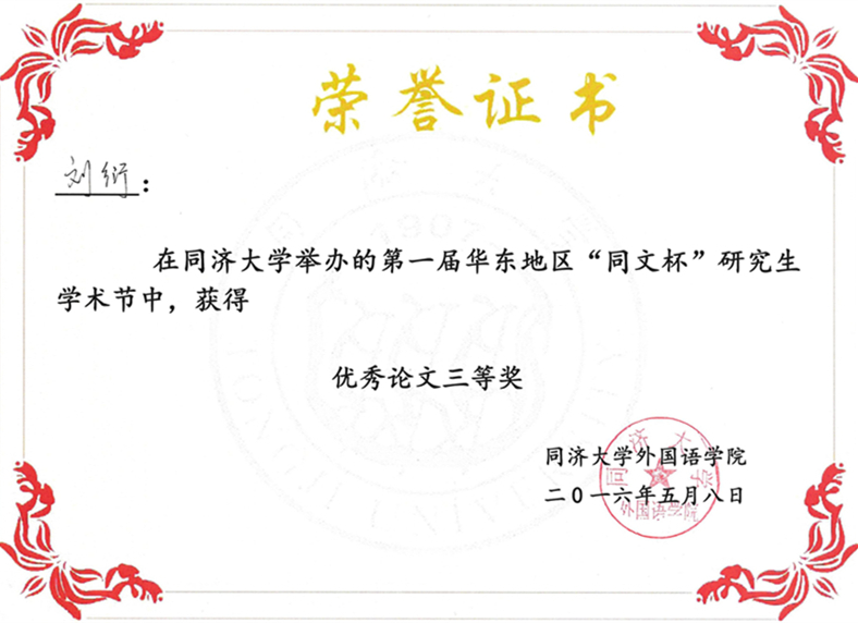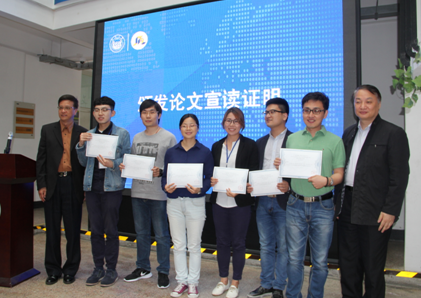 党委书记李立贵副教授颁发的论文宣读证明;之后,选手们依次进行公开展示,接受来自同济大学吴建广教授、上海外国语大学陈坚林教授和华东师范大学张春柏教授、胡范铸教授等评审专家和观众的提问。最终,同济大学博士生王峰摘得一等奖;华东师范大学博士生汤燕和复旦大学韩籍博士生吴有晶获得二等奖;水果派2014级硕士研究生刘衍与同济大学博士生花萌、上海外国语大学硕士研究生金言睿荣获三等奖。