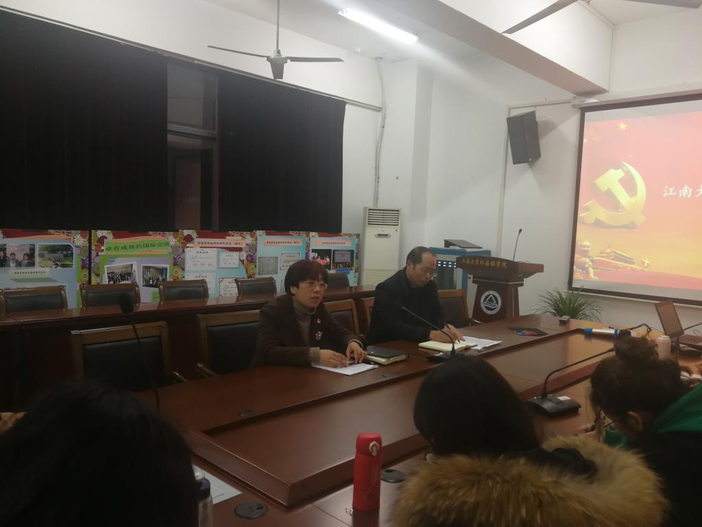 随后,学工部部长张菁燕做出点评。她首先对此次基层组织生活会高效、有序、活泼的开展表示充分的肯定,对支部全体党员积极、主动的参与表示赞赏。她指出青年党员是社会主义的建设者和接班人,必须锻造过硬本领,提升各项能力。将来走上就业岗位,作为教师,立德树人是最重要的任务,要为党育人、为国育才,承担起传播知识、传播思想、传播真理的重任,进外企,做翻译以及其他工作要传播好中国文化,讲好中国故事。另外,她强调,我们要爱国,爱校,发扬江南风格,把个人梦融入江南梦、中国梦,坚定理想信念,增强创新能力,要有大视野、大情怀、大格局。