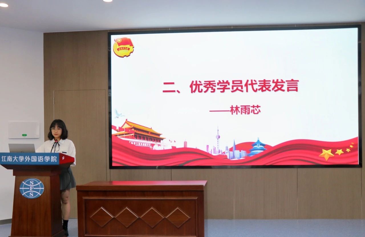 优秀学员代表林雨芯同学发言。她表示无论是专题讲座、素质拓展、还是校外参观,青马训练营期间的每一次经历都让她受益匪浅,她深刻地领悟了马克思主义的真谛、坚定了共产主义的信仰、明确了前进的方向。此外,她还引用宋苏凤老师在第二讲中说到的话“外语人要有理想、敢担当、能吃苦、肯奋斗、扣好人生第一粒扣子”,希望新时代的外语人都能保持初心和对中华文化的热爱和尊重,培养国际视野和理论自信,向世界传递中国声音。