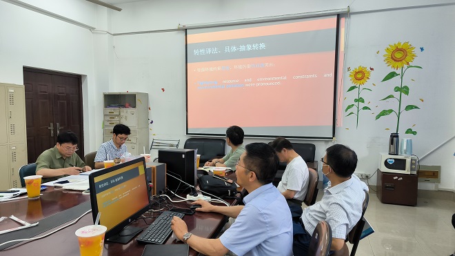 各个课程组教师们也就二十大报告内容如何融入具体的课程作了案例介绍和经验分享。曹乐老师就西方文化课程教学的具体实践,交流了其在课堂中融入文化、价值观对比的相关案例,表明通过将二十大报告中的价值观融入课程,可以帮助学生更好地建立和理解中国当下的文化意识;谢晴副教授介绍了其在商务英语教学中融入二十大报告的方法,包括经贸、财经数据,中国特色金融、品牌案例等等;李昆明博士分享了其将二十大报告作为阅读补充材料和写作实操样本的教学经验;吕洪波博士分享了其在高级英语教学中就环境主题融入人类命运共同体理念和中国环保行动相关精神的教学案例;郑赛芬博士分享了在大学英语教学中融入丝绸之路和一带一路倡议的教学案例;卞正东副教授就其文化翻译课程中的教学经验,提出二十大报告提供了用英文介绍中国文化、引导文化自信的各个细节把握和精神引导,值得好好学习。金波老师从影视翻译技巧的视角上,提出可以引导学生思考如何从技术上处理报告中较长的、时长不对等译本。张俊萍教授、蒋怡博士提出需要多学习,更多地从大视野上把握,将二十大精神和中国的大国思想融入西方文学课,细节处理上需要多学习多思考。李学宁教授提出了从多模态设计视角对二十大报告展开更加具体形象的传播和课程融合。
