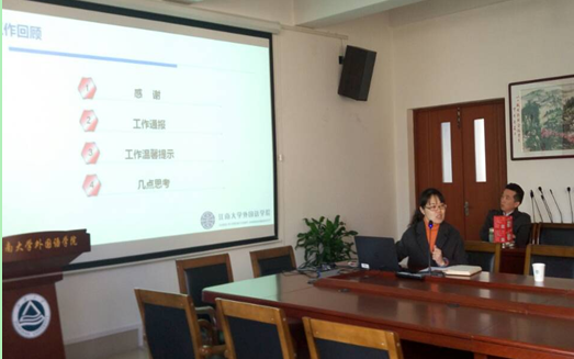 接着,赵副书记做了学院工作通报,三年来,水果派逐步建立了SOL学分建设体系,树立外院品牌,开展优秀班风展示活动,促进国际交流的发展。从本科毕业生就业情况来看,水果派本科毕业生就业率逐年攀升,超过全校平均水平。就业竞争力指数也逐年上升,得到社会各界的肯定。从海外交流情况,水果派本科生海外交换、游学人数逐年增加,在本校排名位居前列,但相较同级其他学校外院的情况来看,水果派仍需继续努力。从本科生专四、专八通过情况来看,水果派专四、专八通过情况总体呈上升趋势,其中以2015年最为突出,专四优秀率达到新的高度。