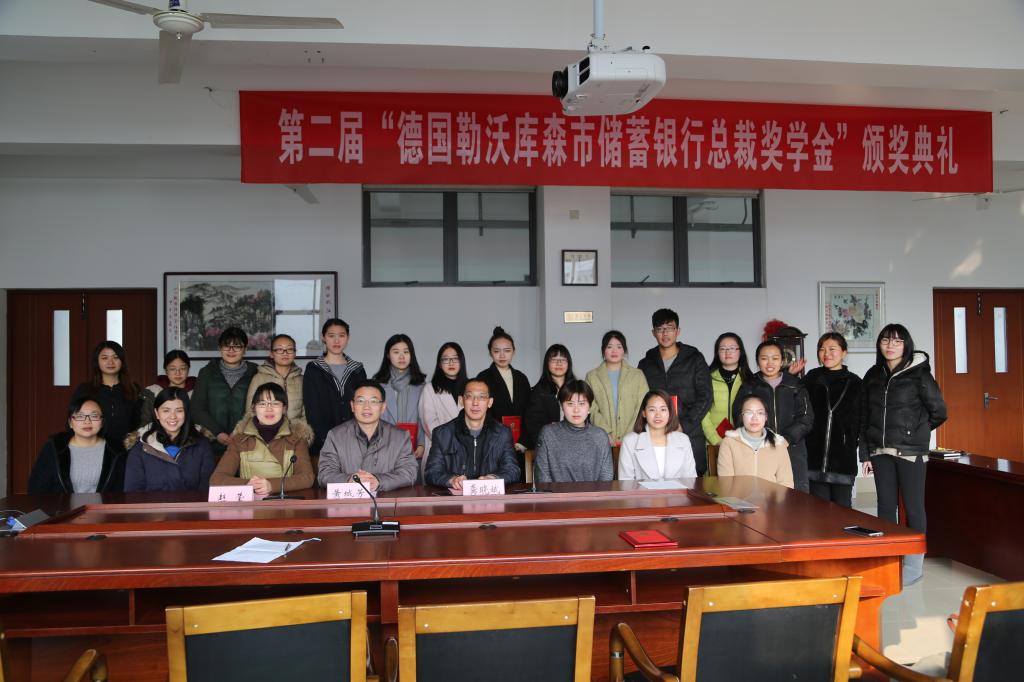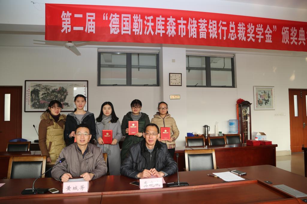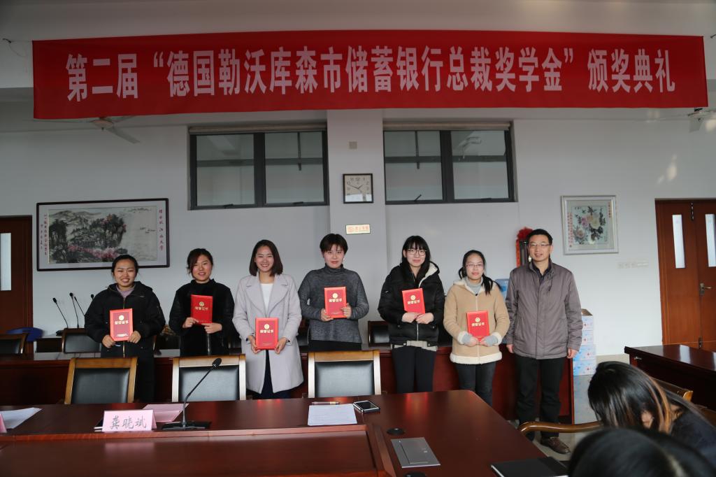 德国勒沃库森市储蓄银行总裁奖学金由德国勒沃库森市储蓄银行总裁曼弗雷德·赫博斯海姆先生捐赠,旨在鼓励和资助品学兼优的本科生及研究生。奖学金经过个人申请、学院审核,最终确定获奖的优秀学生。通过对学生的奖学金奖励,有助于鼓励学生继续努力学习、奋发向上并在个人能力、社会实践等多个方面全面发展。