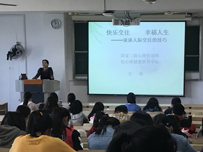 本次讲座旨在帮助18级新生尽快适应大学生活,增强人际交往能力,建立健康的人际关系,成为身心健康发展的人。讲座引用了大量生动鲜活的事例,进行了多次师生互动,同学们在轻松愉悦的氛围中认识了什么是人际交往,人际交往的意义,人际交往的技巧等问题,能帮助新生充分认识到大学生心理健康的重要性,加强心理素质优化,使新生在大学生活中积极、健康、向上的学习和生活。