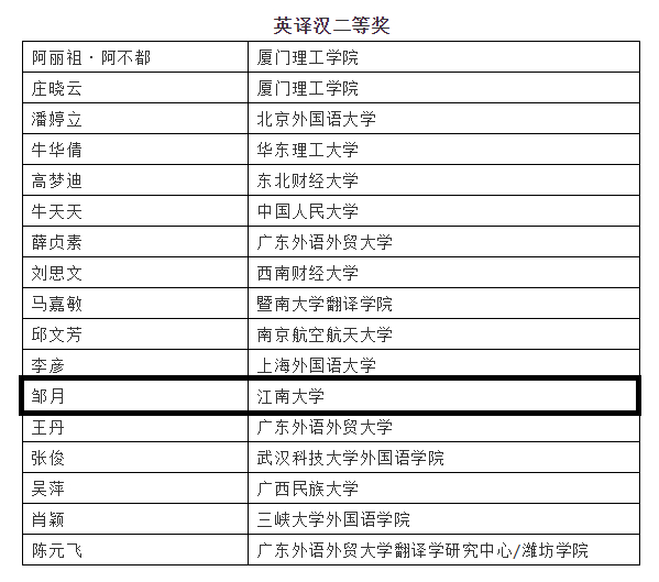 英语语言文学专业17级硕士研究生邹月获得“英译汉”二等奖。