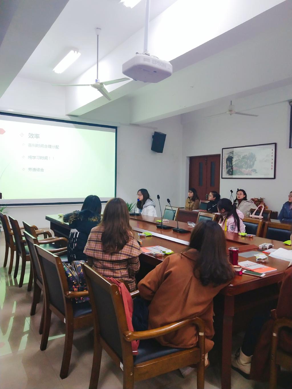 交流会在18:30正式开始,虽然屋外寒风凛冽,但是抵挡不住同学们参加会议的热情。到场分享的四位研究生同学就如何择校、怎样备考,笔试和面试等一系列准备工作进行介绍,侧重点各有不同,让本科生和考研成功的学姐一起面对面交流心得,从而对考研有进一步的认识和了解。