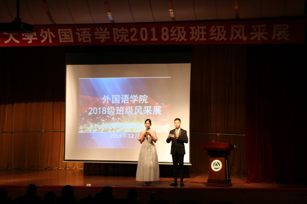 放飞梦想;英语1804班级的主题为《无青春,不狂欢》,淋漓尽致地展示了青春活力;英语1801班级展示主题为《文化融合》,惟妙惟肖地介绍了来自五湖四海的班级成员,融聚在了外院这个大家庭;英语1803班级的主题为《英语1803班的小豆芽们》,把班级成员比喻成小豆芽,充满了向上的朝气。此环节不仅体现了外院学子朝气蓬勃的精神风貌,更是寄托了班级同学对大学生活的美好向往。
