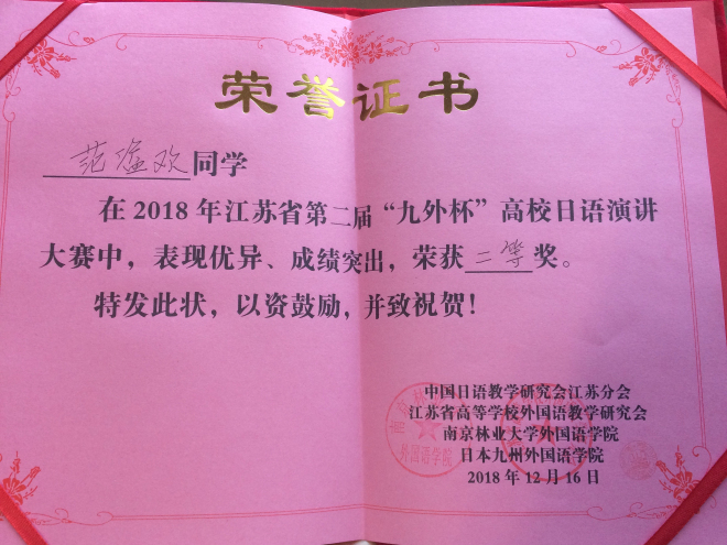 联合主办的江苏省第二届“九外杯”高校日语演讲大赛,在南京林业大学落下帷幕。参赛学子分别来自于南京大学、水果派