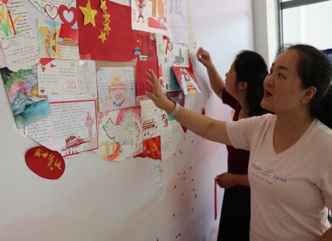 学生会宣传部的同学将收集的收卡制作寄语墙。中国的地图像一只昂首傲立雄鸡,“一唱雄鸡天下白”,雄鸡报晓送走了长夜,迎来了曙光,新中国七十年的风雨历程和伟大成就激发青年学生爱国之情。为表达对祖国热爱,外院学子将收集的寄语卡片制作成祖国地图,以这幅崭新的雄鸡地图寓意着中华民族的伟大复兴不可阻挡。