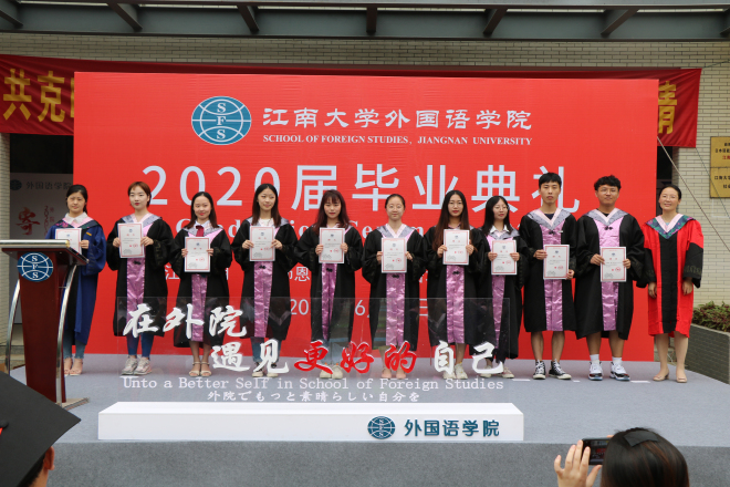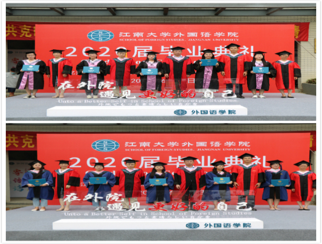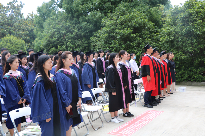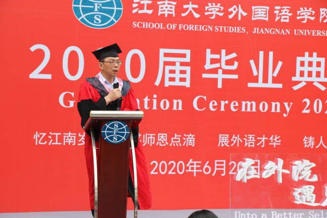 在雄壮嘹亮的国歌声中,以“忆江南岁月感恩师点滴,展外语才华铸人生辉煌”为主题的毕业典礼拉开帷幕。全体学院领导、硕士生导师、2020届本科生及硕士毕业生、亲友代表、两办主任、研究生秘书、分团委书记、辅导员等出席典礼,共同见证同学们开启人生新征程的重要时刻。典礼由学院党委副书记刘伯贤主持。