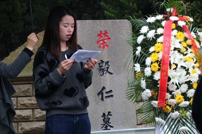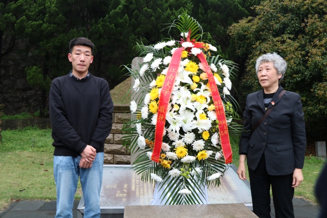 发展。随后,由王武老师和学生代表庄重地向陵墓敬献花篮。英语1803班陈芝佳同学作为学生代表诵读祭文,表达了对荣副主席的高风亮节、丰功伟绩、家国情结以及其崇高品格的追思与敬重,并表示我们应刻牢记初心使命,以实际行动抒发爱国情,践行报国志。活动最后,参加祭扫的同学和老师们向陵墓鞠躬并静默哀思三分钟,结束后绕墓地一周并献上鲜花,表达对荣副主席及夫人的深切哀悼和敬仰。