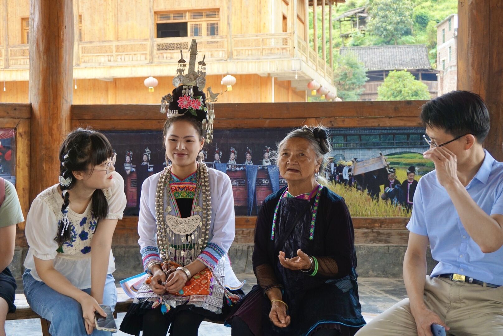 侗歌声悠扬,翻译助传承。侗族大歌是联合国教科文组织列入的人类非物质文化遗产,为更好地推动《侗族大歌志》英文翻译工作,助力侗族大歌保护与传承,实践团成员赴贵州省从江县开展翻译调研采风活动。7月16日上午,“译见中情”育人工作室实践团在育人工作室负责人朱义华副院长的带领下同从江县周惠林副县长带队的县政府相关部门开展侗族大歌文化交流座谈会,双方就侗族大歌翻译与传播的现状与难点进行了深刻的讨论。第二日,实践团成员前往高增乡小黄村采访潘萨银花、贾福英两位国家级非物质文化遗产传承人,跟着两位传承人学习、体验侗族大歌,并一同欣赏了侗族大歌表演,亲身体会侗族千年文化的独特魅力,为后续侗歌翻译工作的推进奠定了认知与专业基础。