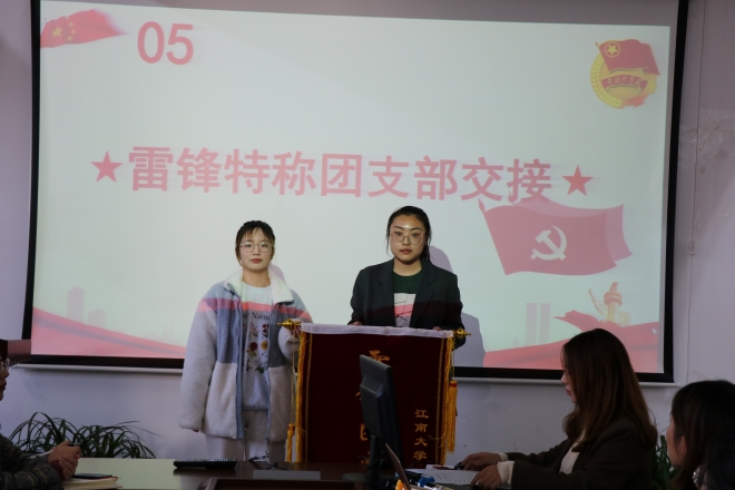 “雷锋特称团支部” 英语1803团支书史雪茹同学通过对过去三年团支部丰富活动及团员青年优异成绩的图文展示,展现了英语1803团支部在雷锋精神的指引下,“拼搏向上,奋勇争先”的青春风采。新一届“雷锋特称团支部”英语2001团支书郑若琳同学从史雪茹同学手中接过雷锋特称团支部的锦旗,表示将认真学习、践行雷锋精神,将特称团支部的优良传统传承、发扬。