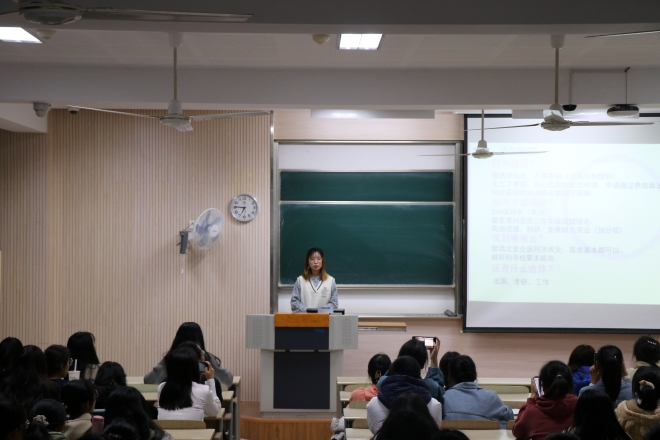 成功保研至南京大学的仲洲瑶主要向大家分享了自己保研的学习经历,在分享过程中,她提到了三个关键词:兴趣、效率、竞赛。保研至华中科技大学的周心怡主要进行专业保研分享,她围绕“学涯规划、专业课学习、提升软实力和硬实力”几个方面进行介绍。获得国家奖学金的盛晓妍以“志当存高远,不负少年时”为主题分享了自己获得国家奖学金的学习经验。保研至南京大学的史雪茹以“遇见更好的自己”为题进行分享,她分享了自己本科阶段的“学习篇”、”生活篇“以及“学习感悟”。经验分享后,现场的同学也就自己感兴趣的问题与四位分享同学进行交流。会后同学表示感触很深,在今后的大学学习生活中要明确自己的奋斗目标,做好自己对未来的规划,从而为之不懈地努力奋斗,充实自己的大学生活。