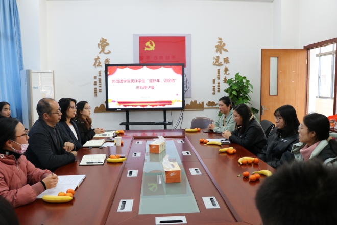 在A331召开2021年少数民族学生“迎新年,话团结”迎新座谈会。学院党委副书记刘伯贤老师、新疆维吾尔自治区教育厅派驻水果派