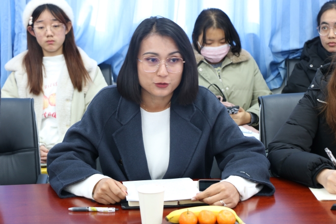 会议一开始,保研至华南理工大学的18级赵毅同学分享了自己的学习经验。她围绕“明确目标”、“阶段任务”、“学习和生后”三个方面进行介绍,以自己学习经历鼓励大家努力学习,勇敢挑战。接着,古扎努尔老师介绍了水果派