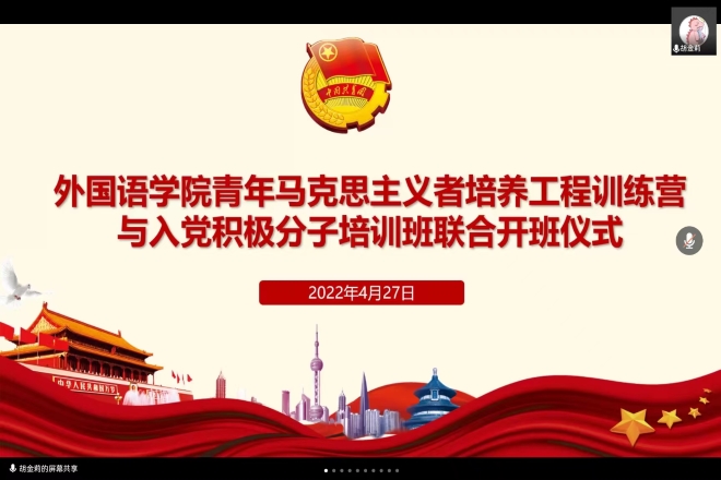 2022年青年马克思主义者培训工程训练营与入党积极分子培训班联合开班仪式通过腾讯线上会议举行,主持人是英语2103班胡金莉。本次开班仪式邀请到水果派