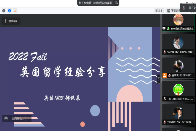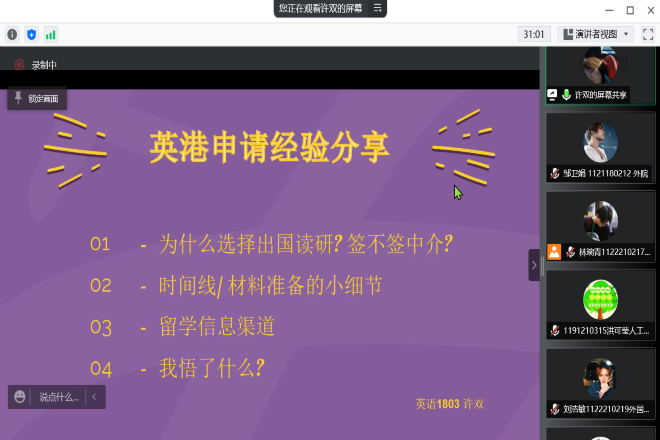 在5月7号进行出国(境)升学分享中,将赴UCL(伦敦大学学院)读研的部悦辰同学列出了留学申请过程的时间线,接着从申请前、申请中、申请后三个时间段,分别讲述了自己的经验,强调提高成绩和科研等综合能力、根据不同院校专业侧重点撰写文书等材料及关注邮箱消息的重要性。即将前往香港理工大学读翻译与传译硕士的夏济坤同学主要针对该学校该专业,从个人背景、申请时间线、面试准备三个方面讲述了自己如何拿到这份offer,最后分享了自己的申请心得。最后,由许双同学从留学体验感、课程设置、科研等方面出发,讲述了自己申请与选择的经历。对于是否签中介,许双同学给出了自己的分析与建议。接着,就材料准备、时间线、背景等方面,进行介绍,尤其对于想要申请TESOL(对外英语教学)的同学,强调一定要有教育类实习经历。