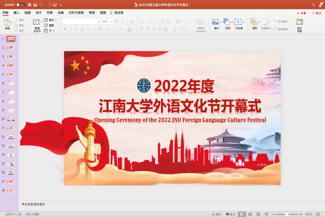外语文化节是加强校园文化建设的阵地,是提升学生专业素质和营造良好学习氛围的有效载体。2022年是中国共产主义青年团成立一百周年,新时代青年应当“笃行不怠,奋发向上”,在新的征程中留下属于自己的青春印记,以闪光的青春迎接党的二十大胜利召开!