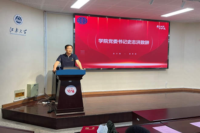 开学典礼开始前,22级新生通过观看《遇见·外院》宣传片对学院有了进一步的了解。开学典礼在庄严的国歌声中拉开帷幕。首先,学院党委书记史志洪致欢迎辞。史志洪首先欢迎2022级新生加入外院大家庭,在谈到如何过好大学生活时,他提出三点希望:第一,要志存高远,做有底气的人;第二,要好学力行,做有朝气的人;第三,要挑战自我,做有勇气的人。史志洪强调:青春是人生中最美好的年华,大学是人生中最重要的阶段,大家要在江大外院跑出青春的最好成绩。