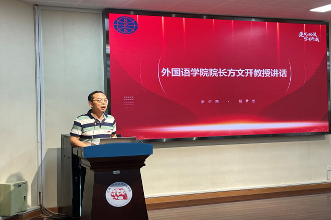 院长方文开讲话。他对同学们提出希望:用外语讲好新时代的中国故事。做到这一点,要理解时代,认识时代,打下扎实基础,了解中国文化。讲好中国故事是当代青年之责任,外院学子定当不负众望,以时不我待的精神,用外语讲好中国故事,讲好传统文化的故事,讲好未来的故事。