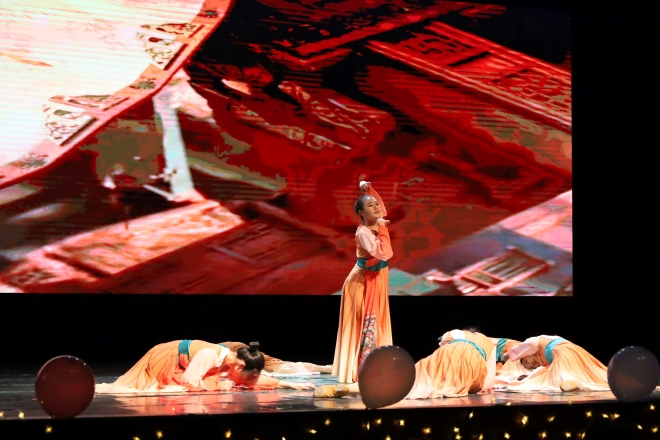 晚会由狂花乐队表演的《言って》开场,气氛热烈,燃爆全场。第一篇章淡墨韵景忆长安:由艺术团带来的民舞《唐印》,舞姿优美,唐韵悠长;器乐《寻你》除了学生的乐器表演,还邀请了水果派