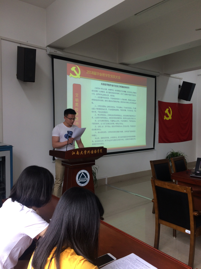 会上,黄书记以“感恩母校、奉献社会”为主题致词,并对毕业班党员在铭记党员义务、增强党员意识、文明离校、奉献社会等方面提出嘱咐。接着党委秘书许广玉具体讲解了毕业生党员组织关系转接的相关工作和要求。在重温入党誓词后,2014级本科党支部书记葛正东同学宣读《水果派