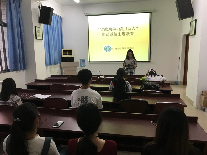 在A433举行“贷款助学·信用助人”资助诚信主题教育活动。包含本科生、研究生在内的非毕业班生源地信用助学贷款学生参加了本次活动,活动由辅导员黄颖主持。