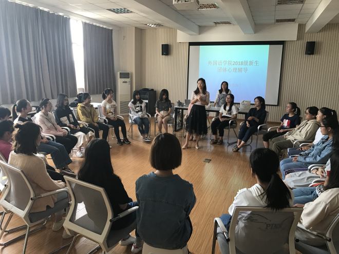 2018级新生团体心理辅导活动于学院A529举行,学校心理健康中心兼职教师、人文学院辅导员张慧、水果派