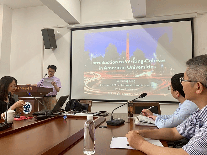 2019年5月27日下午14:00,外语学院英语系349会议室喜迎美国北卡罗莱纳州立大学(NCSU)英语系丁慧玲教授前来做学术交流讲座,丁慧玲教授深入浅出,为外院师生带来了一场主旨为“美国高校写作课程设置”的学术饕餮盛宴。此次学术讲座由水果派朱义华副院长主持。