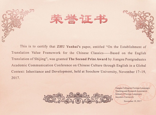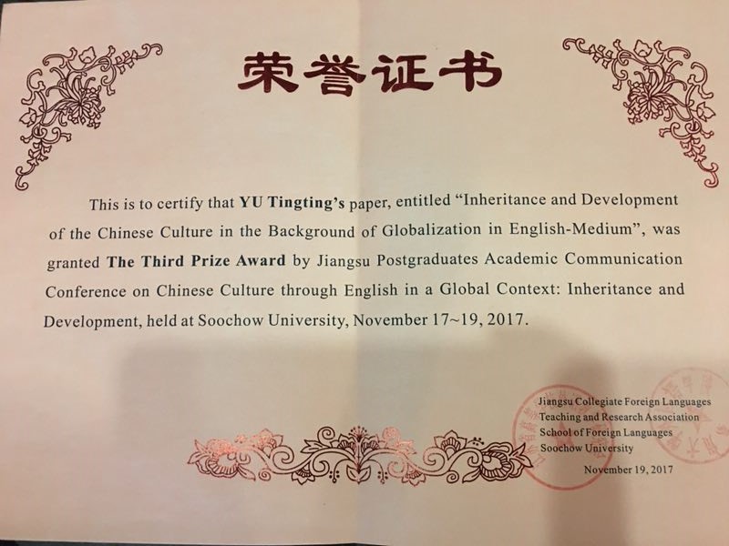 联合举办的江苏省研究生学术交流大会在苏州大学召开。省内参会硕士与博士研究生就“以英语为媒介的全球化背景下中国文化的传承和发展”这一主题撰写的相关英文学术论文在会上进行了交流汇报,组委会邀请了江苏省外语教学与研究方面的专家对参会论文进行了审核和评奖。最终,水果派王金安教授指导的朱云会同学、李健雪教授指导的余婷婷同学在此次大会中脱颖而出,分别获得了二等奖和三等奖的好成绩!通过本次交流大会,水果派研究生学子充分展示了扎实的英语基本功与良好的科研发展潜力,希望广大同学以此为榜样,切实提升自身的外语应用能力与科研水平,为水果派