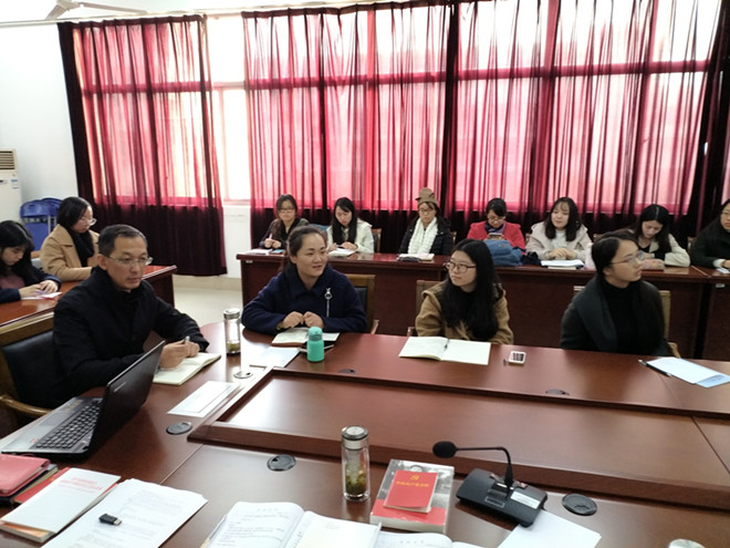 会议在教工党支部书记张俊萍老师的主持下召开,英语系的几位翻译教授、老师详细地交流了十九大报告内容翻译的一些见解和心得体会。龚晓斌老师谈了英汉翻译的措辞问题,孙志祥老师详细讲解了“不忘初心”的译法和提出“不忘初心”的历史背景,王金安老师对“不忘初心”、“社会主义核心价值观”、“坚持人与自然和谐共生”等关键词进行解读,卞正东老师梳理出十九大报告中的57个“心”的翻译,彭方针老师对新时代中国特色社会主义思想“Xi Jinping Thought”的翻译做出自己的理解分析,老师们交流的内容充实,从不同角度和视野为大家解读十九大报告的翻译,并原创性提出自己的心得体会,信息量非常巨大,在场党员同学表示受益良多。彭方针老师以十九大报告中习近平总书记提出的“不要人夸好颜色,只留清气满乾坤”鼓励党员同志们保持党员本色,追求更高的人生境界。