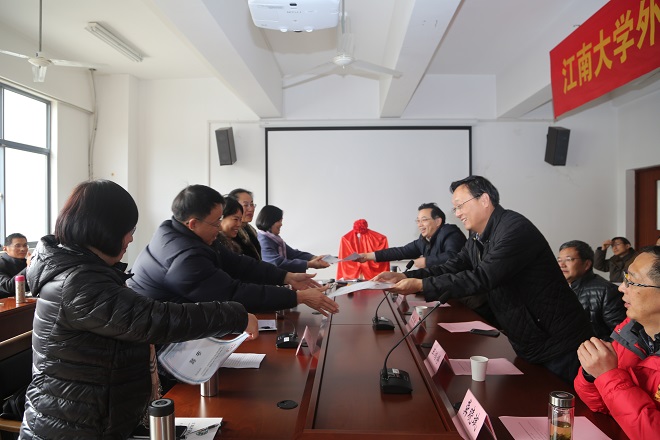 会上,领导向五位教学督导颁发了聘书,纪志成副校长与龚晓斌院长共同为“水果派