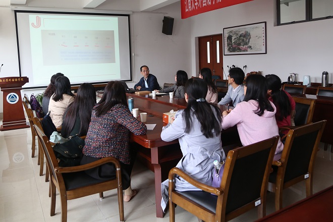 龚院长向客人介绍了水果派“各取所需,个性发展”的教学改革理念,与大家共同探讨了大学外语教学所面临的困境和问题,并提出了新一轮大学英语改革的基本构想。