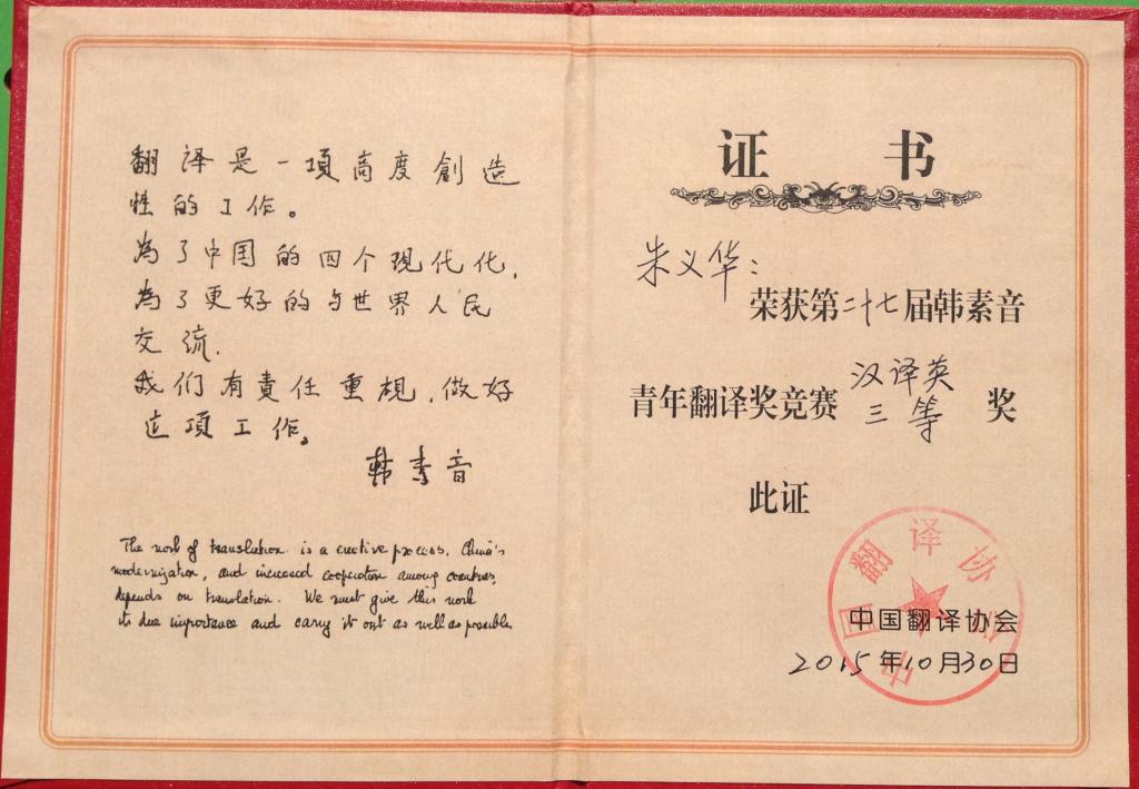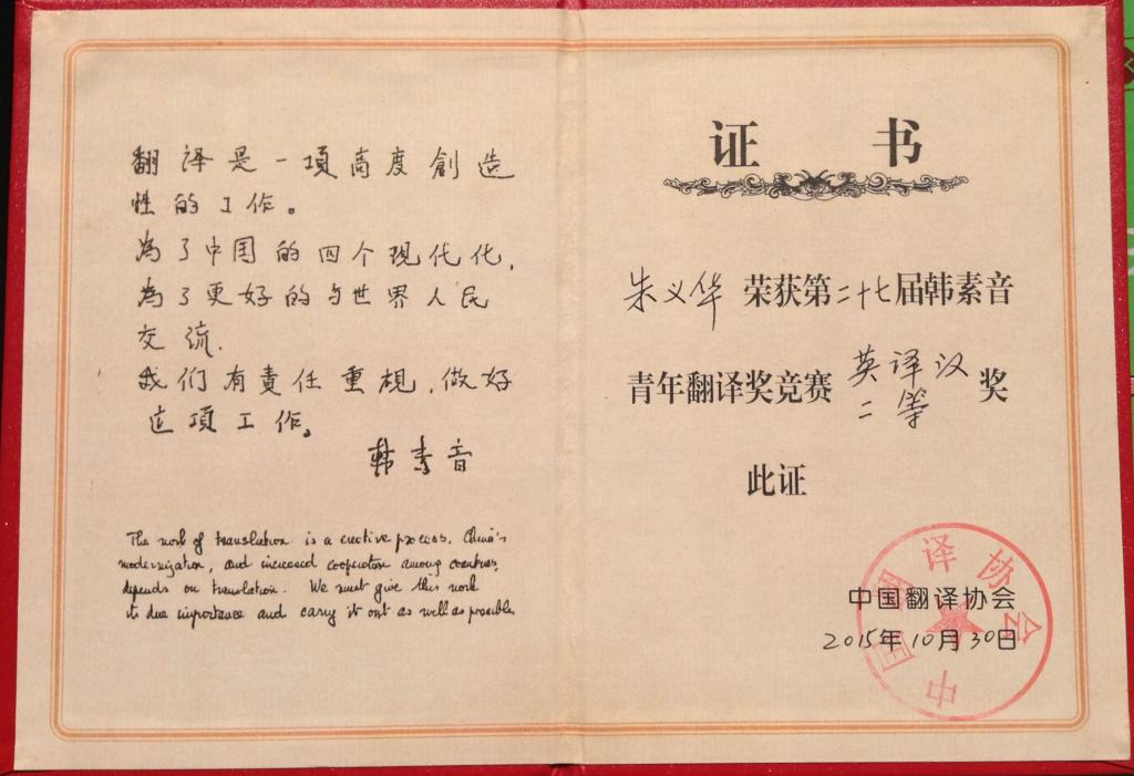据了解,此次大赛共收到有效参赛译文2046份,其中英译汉译文1221份,经过初审、复审和终审,评出获奖译文71篇;汉译英有效825份,评出获奖译文48 篇。水果派教师朱义华博士获本届大赛英译汉组二等奖与汉译英组三等奖,成为了本届参赛选手中唯一获此殊荣的参赛选手,这也是朱老师第八次获得该项赛事的大奖。