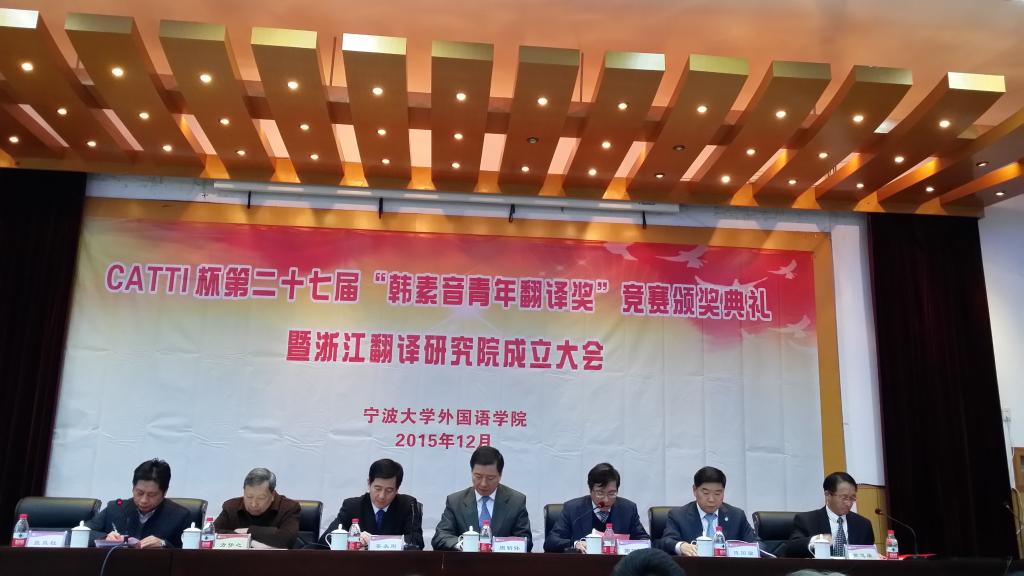 12月5日,CATTI杯第27届韩素音青年翻译奖竞赛颁奖典礼暨浙江翻译研究院成立大会在宁波大学举行,中国外文局局长、中国翻译研究院院长、中国翻译协会会长周明伟,宁波大学党委书记郭华巍,中国外文局国际合作部主任、中国译协常务副秘书长姜永刚,《中国翻译》杂志副主编、中国翻译协会翻译理论与翻译教学委员会副主任兼秘书长杨平,宁波市外事办公室副主任陈国苗,国务院学位委员会“外国语言文学”学科评议组成员、广东外语外贸大学教授、博士生导师、珠江学者特聘教授黄忠廉教授,中国资深翻译理论家、上海大学方梦之教授,新加坡南洋理工大学教授谭慧敏等领导与专家出席了颁奖典礼。大赛评审委员会的部分专家、学者、大赛获奖选手和相关代表参加典礼。