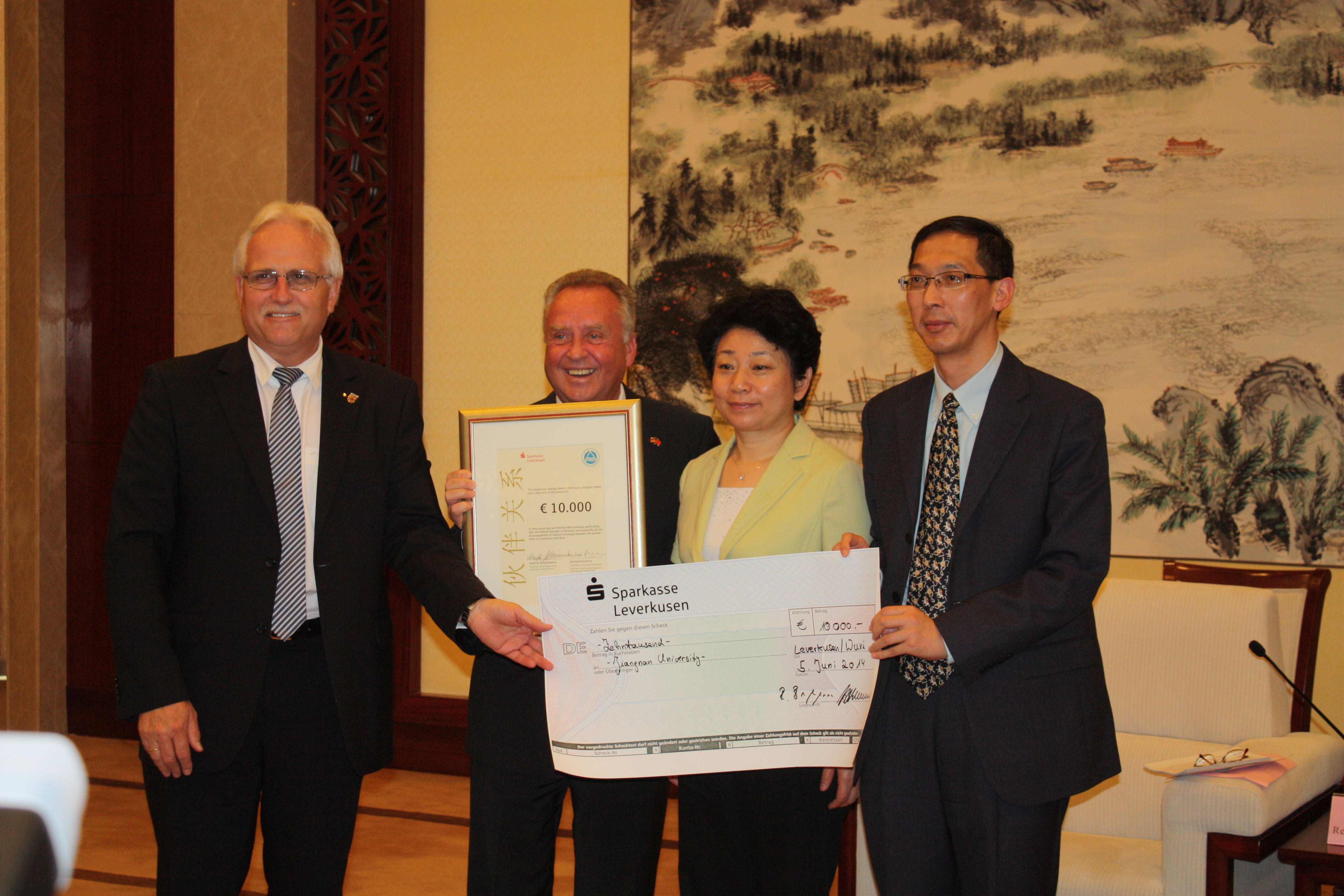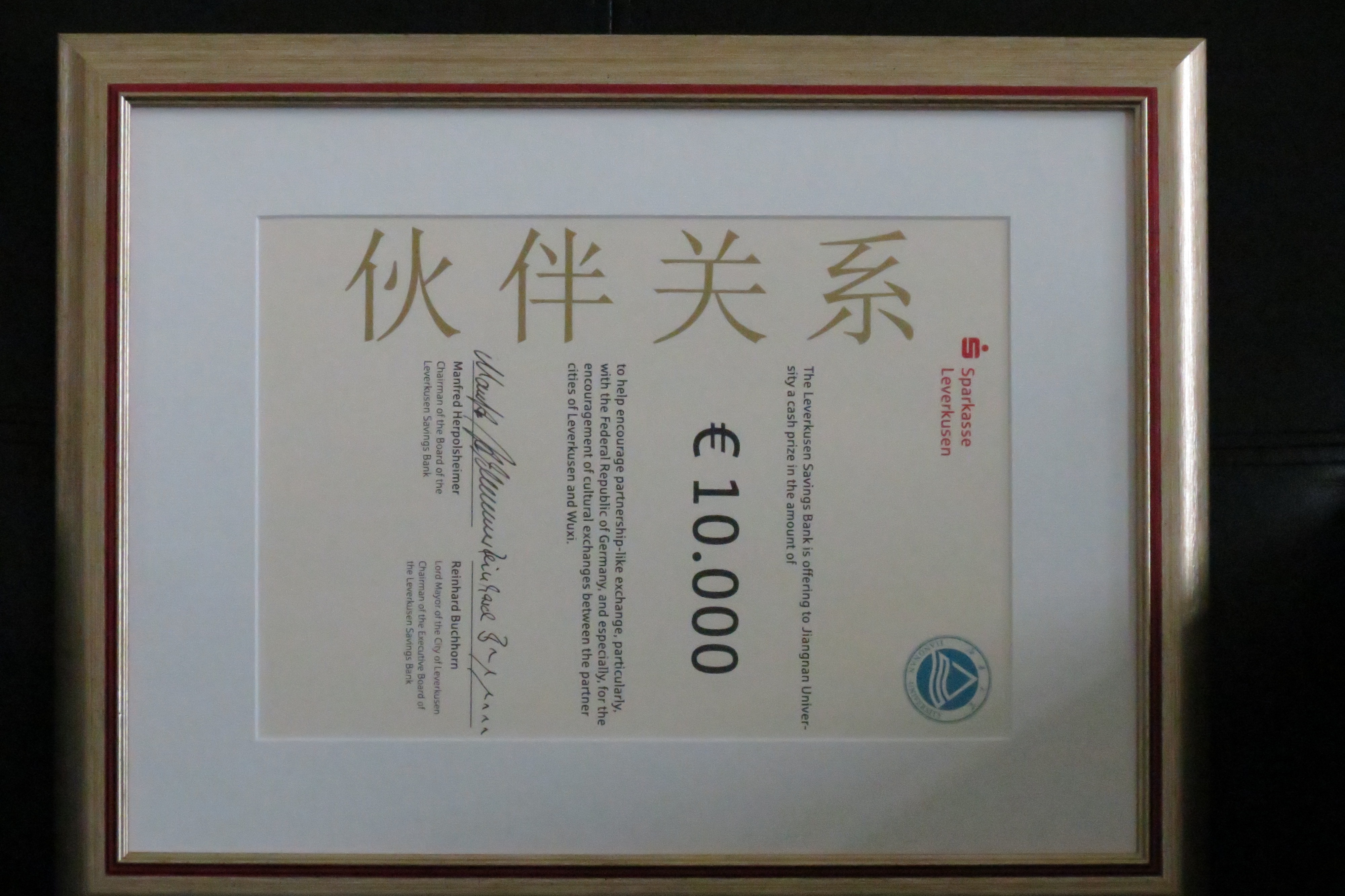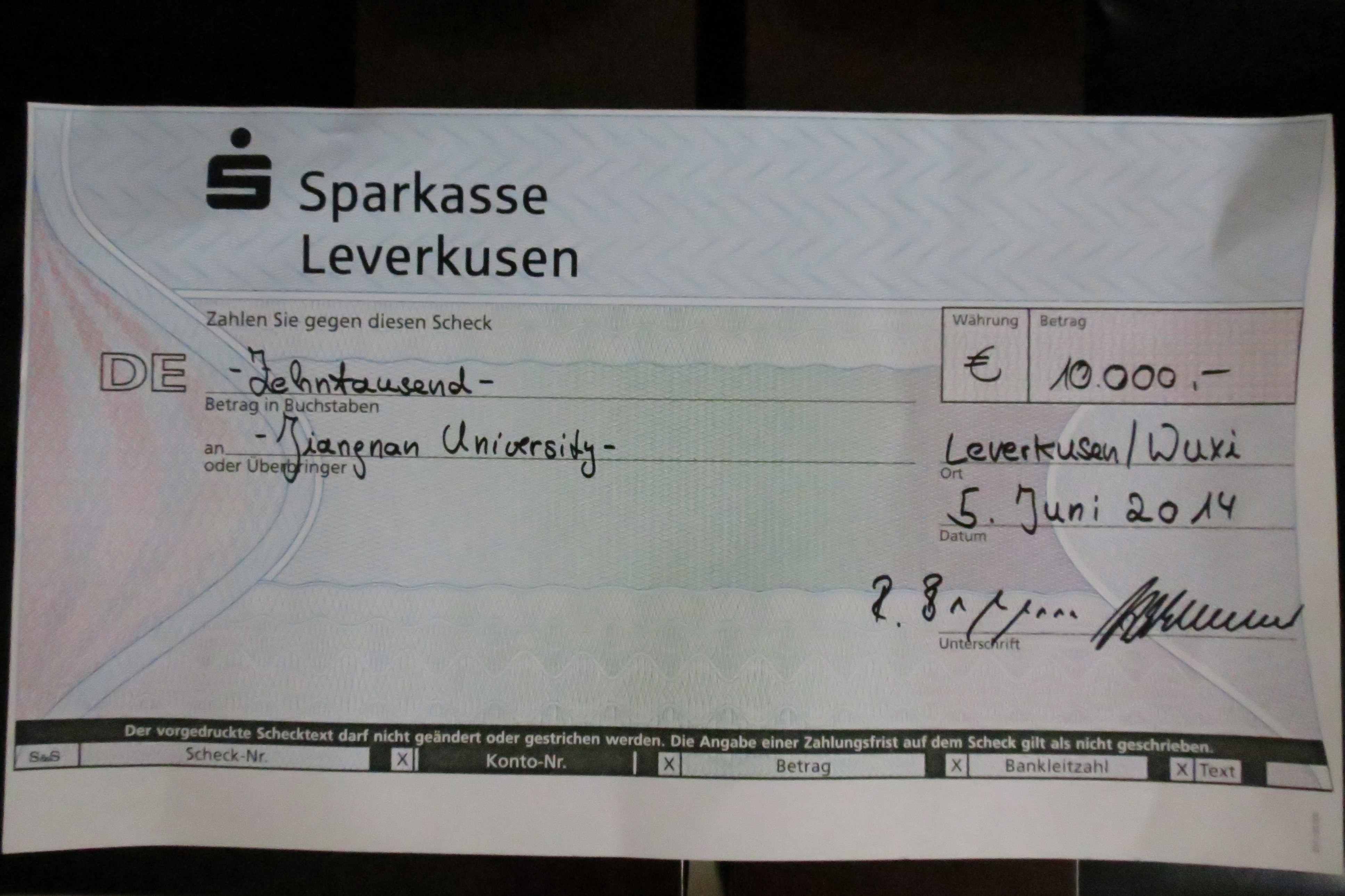 龚晓斌院长代表受捐方从曼弗雷德·赫博斯海姆手中接过了捐赠支票和“伙伴关系”证书。此次捐赠活动得到了朗盛(无锡)化工有限公司和水果派德语教师邢爱华的大力支持,特此致谢。