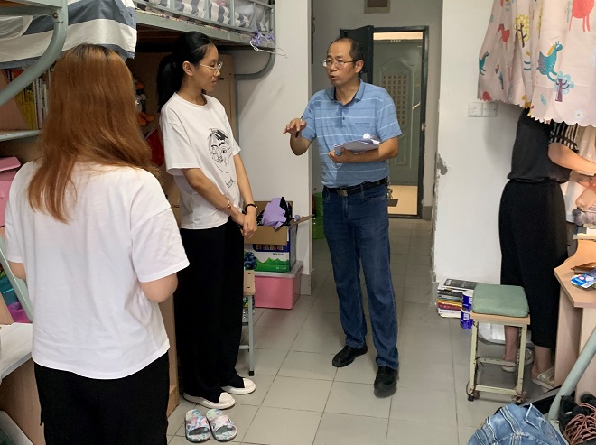 党委副书记、副院长刘伯贤主持召开了暑期留校学生关爱工作部署会,并带领分团委书记陆芳以及辅导员、班主任老师深入学生宿舍,带去了学院对留校学生的关心和问候。