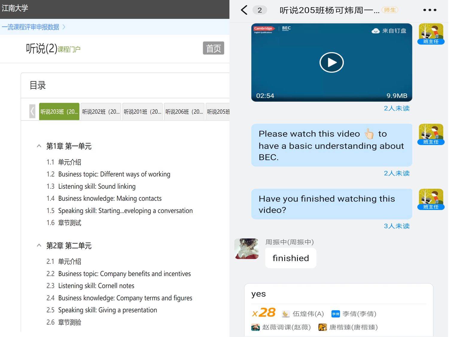 《听说(2)》课程是校级精品在建课程,此次在线课程基于“钉钉”和“超星学习通”两个平台,构筑网络学习双通道。“钉钉”平台用于发布学习流程及学习任务、进行在线实时互动;“学习通”平台用于检测学生学习情况、观看《听说(2)》在线精品课程章节,复习课堂知识要点和拓展内容。双平台的使用保 证了线上线下教学内容的有效衔接,构建了完整学习闭环。
