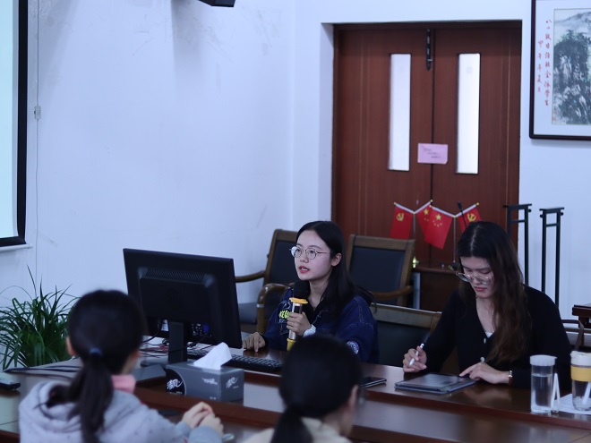 活动的第一个环节,四位线下参加本次论坛的20级研究生分享了她们的心得体会。张梦兰同学从“论文选题”、“论文发表”、“学术会议”、“总结感悟”四个方面发表了自己的见解,分享了一些获取文献资源的方式,建议同学们善用各种平台主动关注会议信息。袁咏雪同学在“会前准备”和“论文撰写”方面展示了自己的方法并提出了一些建议,在谈到参会心得时,她将学术论坛作为一个难得的学习交流平台来看待,建议同学们要摆正心态,端正态度,找到自己的节奏。彭丹同学首先对论坛上各专家的发言进行了总结,建议同学们要善于应用对比的方法进行学术研究,善于将时事政治与研究相结合,要树立正确的科研观,进行跨学科的研究。曹玥同学从“选题”和“收获”两方面进行分享,建议同学们在选题时要顺应研究的主流方向,同时也要注意平衡研究的创新性和可操作性。