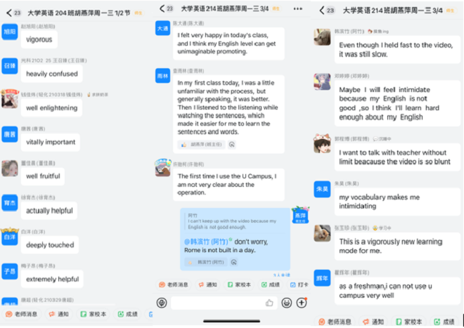 21级大学英语3个课程组根据教学内容与学情,以提升学生的综合应用能力为重点,同时培养学生的思辨能力与跨文化交际能力,更新教材,统一制定导学文件,引导学生充分了解学习任务,学会合理利用各具特色的在线资源:U校园微课、词达人词汇练习、批改网朗读平台等,在用中学,利用平台数据反馈与跟进措施,保证在线教学质量。
