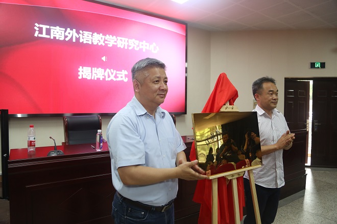 徐岩副校长和无锡教师发展学院周逸君院长一同揭开红幕、宣告江南外语教学研究中心正式成立。会后,与会领导、嘉宾在水果派
