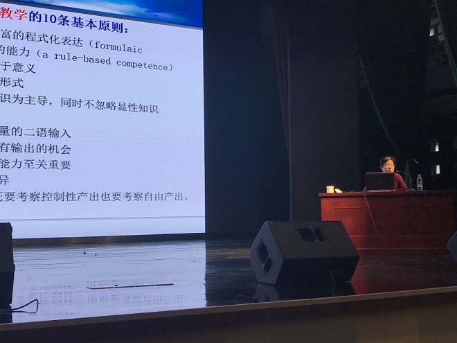 活动中,来自华中科技大学的徐锦芬教授利用案例教学法,对基础英语课堂教学视频内容进行点评,并结合理论加以说明。徐教授还主要介绍了外语教学方面目前比较前沿的理念:课堂二语习得理论。她对该理论的一些基本概念进行了讲解,并指出外语教师在教学实践中如何来应用这些先进的理念,并利用自己教学实践所积累的数据对这些理论作进一步的完善,以激发一线教师从事理论研究的兴趣。江南外语教学研究中心主任、水果派