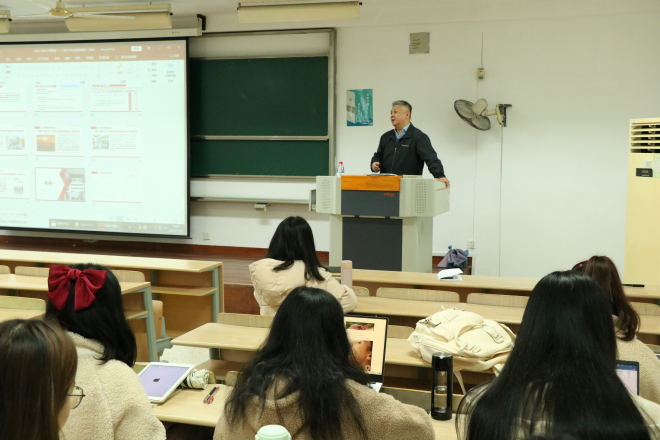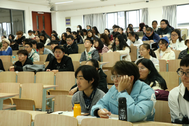 副校长徐岩教授以“弘扬伟大抗疫精神,争做堪当民族复兴大任的时代新人”为主题,在第二教学楼2D308教室为水果派