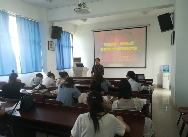 在A433召开贷款毕业生诚信教育大会。毕业年级全体贷款学生参与了此次大会,会议由毕业班辅导员杨艳主持。