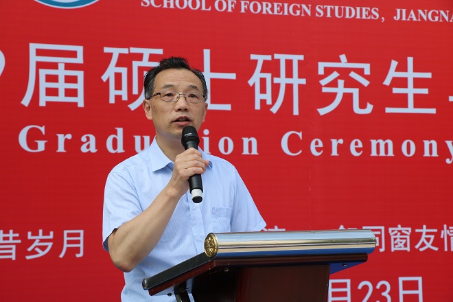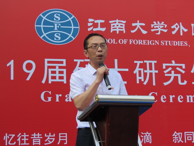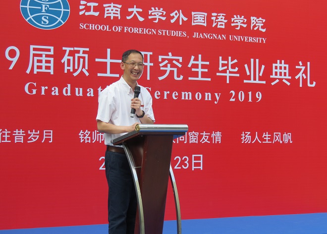 龚晓斌教授作为导师代表发言,他以幽默诙谐而又不失庄重的英文表达了对毕业生们的殷切期望和忠心祝福,希望同学们在成长路上学会选择、学会坚持,也学会放弃、学会追求属于自己的精彩人生,并表示外院永远是“our home”。