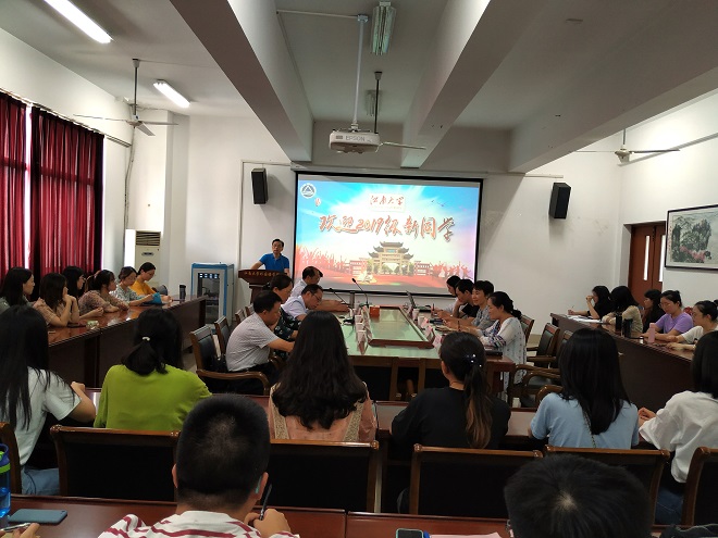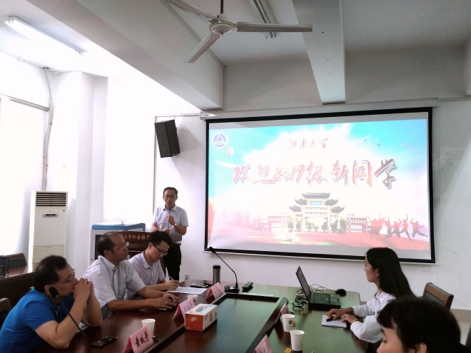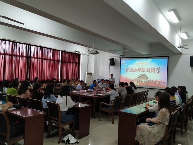 党委黄城芳书记、方文开院长、刘伯贤副书记、施惠平副院长、朱义华副院长、教师代表王金安教授、院行政办公室主任华芒老师,院党委秘书许广玉老师与研究生辅导员杨艳老师,研究生老生代表2017级吴佳同学和2019级全体新生,朱义华副院长主持了本次活动。