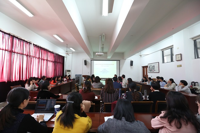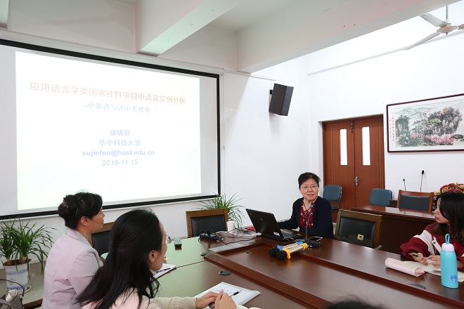 二级教授,博士生导师徐锦芬老师主讲,讲座的主题是:应用语言学类国家社科项目申请及实例分析。参与本次专题讲座的有从事英语教学、二语习得研究的教师和各年级研究生,讲座现场气氛热烈,座无虚席。