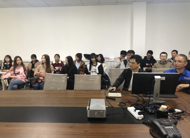 参观完车间装配区,同行的公司付经理带领大家来到了4楼的会议室,面对面地与学生进行交流座谈。付经理为即将面对实习就业的同学详细介绍了公司历史、组织架构、产品概况、客户分布、公司的生产线以及十年的发展历程。目前公司已经在新三板上市,客户已经遍布世界各地。通过付经理幽默风趣的介绍,大家对生产和测试汽车零部件的工作有了新的了解,也对外语专业的就业有了更深刻的认识。最后,付经理还给大家分享了自己工作12年得到的经验,给即将踏上社会的同学们提供了很多有用的人生建议,也为即将踏入社会的同学们增添了信心和力量。