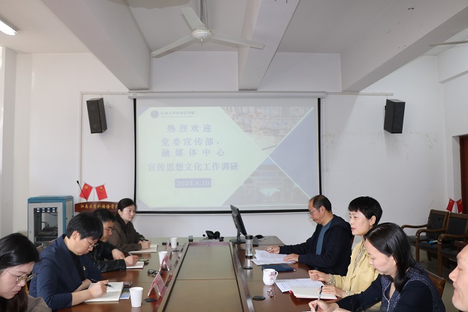 学院党委书记李荣华汇报了学院近年宣传工作情况。党的二十大召开以后,学院迅速行动起来,制定学习方案,开展专题辅导报告、讲党课、学习党代表故事、参观红色展馆、制作微党课等活动,引导师生把思想和行动统一到党的二十大精神上来,确定了学院学习教育的主题“走读二十大,奋进新征程”,和江南文化传播相结合,奋进时代使命、育人担当。在“三全育人”工作中,学院围绕“讲外国语、说中国事、铸中国魂”,发挥外语专业优势,开展课程思政、教育教学改革、外语文化精品系列的打造等工作,讲好中国故事,讲中国好故事,展现真实立体全面的中国形象,推动中华文化更好的走向世界;同时与学校其他部门、学院增进交流,接轨学校中心工作,为学校的文化育人和国际化建设贡献外语力量。李书记还汇报了学院宣传工作特色、机制和近期宣传重点等其他内容。